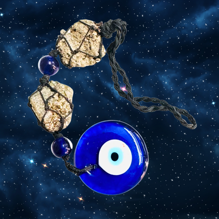 Evil Eye Charm with Pyrite Gold Stone Hanging – Perfect for Car, Home & Office Protection
