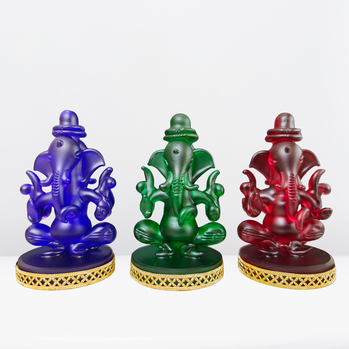 Bring blessings, wisdom, and prosperity into your life with the Folkskulture 2 Face Ganesha Idol. Designed with intricate detailing and crafted from premium glass, these idols come in three vibrant variants – Blue, Green, and Red.